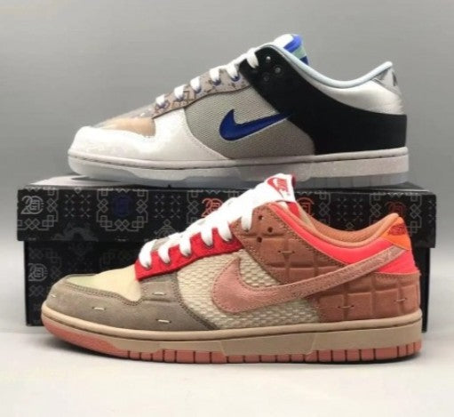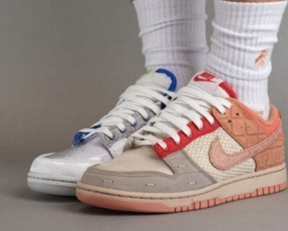 The CLOT x Nike SB Dunk Low “What The” is a vibrant mashup that celebrates CLOT’s 20-year collaboration with Nike. Featuring a mismatched design, it blends iconic elements from past CLOT releases like the “Kiss of Death,” “Silk Royale,” and “Terracotta” editions. With silk overlays, transparent panels, and asymmetrical Swooshes, each shoe tells a story of cultural fusion and creative evolution—making it a true collector’s piece and a symbolic farewell to the CLOT x Nike legacy.