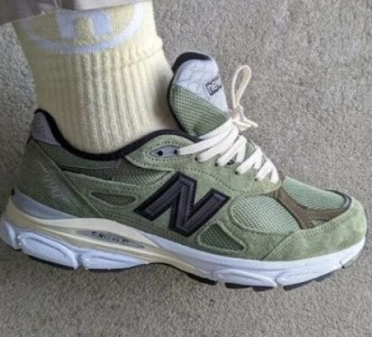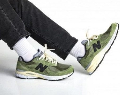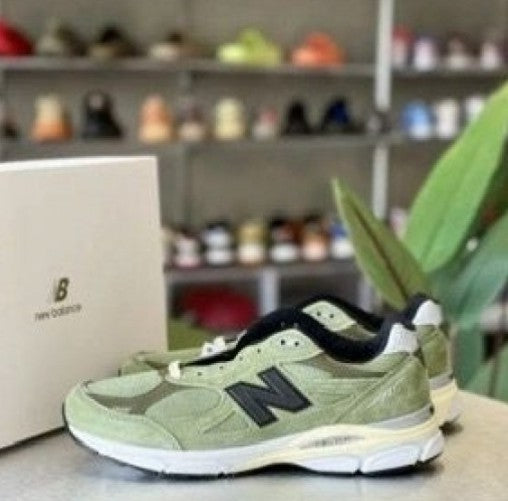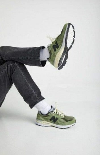 The New Balance 990v3 JJJJound "Olive" is a premium collaboration between the Canadian design studio JJJJound and New Balance. This edition features an earthy olive green mesh base with matching suede overlays, creating a subtle and refined aesthetic. Accented with black details on the "N" logo, heel tab, and midsole, it balances rugged style with minimalist design. Built on the classic 990v3 silhouette, it offers superior comfort with ENCAP cushioning and a durable rubber outsole. This pair embodies understated luxury and timeless streetwear appeal.