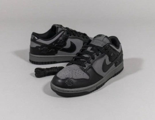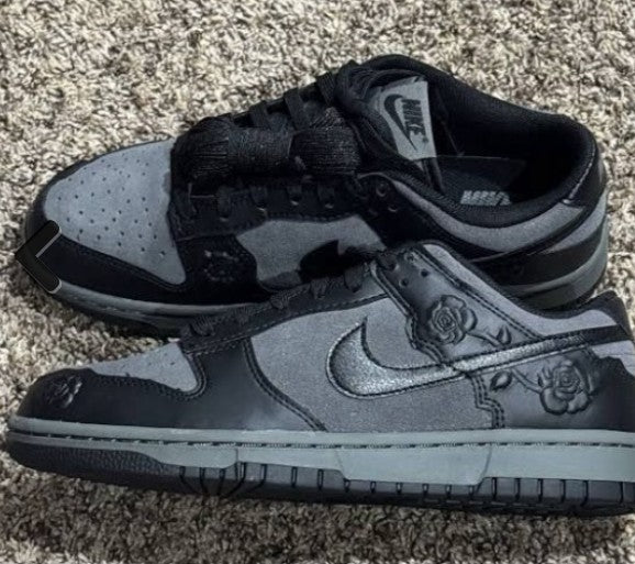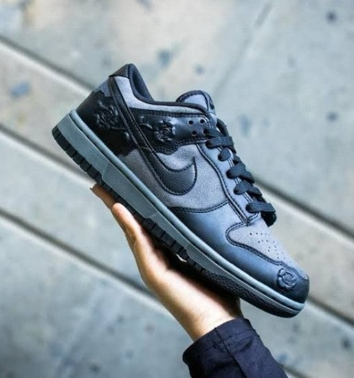 The Nike Dunk Low Black Roses features a striking black leather upper adorned with bold red rose embroidery, symbolizing a blend of elegance and street style. Contrasting white midsoles and a dark outsole complete the sleek look, making it a standout piece for both sneakerheads and fashion-forward individuals.
