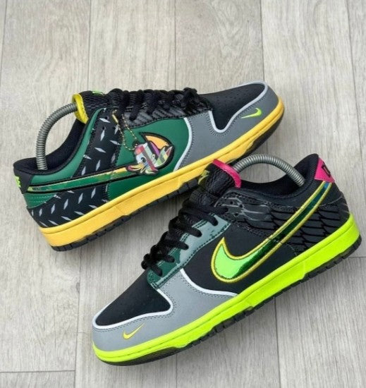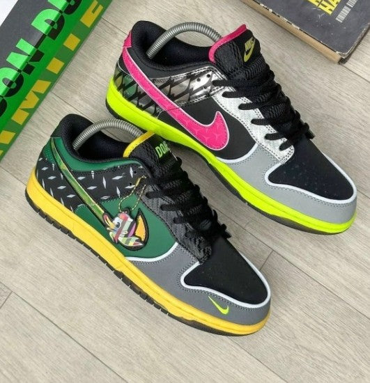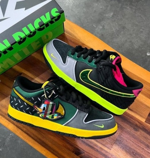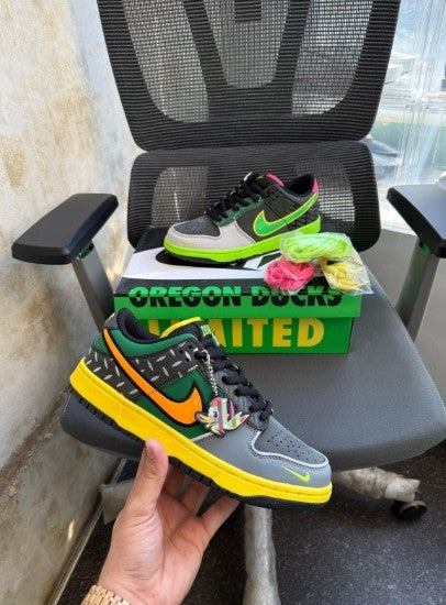# Nike Dunk Low What The Duck University of Oregon is a bold mashup sneaker paying tribute to the Ducks. It features a vibrant mix of colors, patterns, and materials inspired by various Oregon PE editions. With signature Duck branding, mismatched panels, and premium textures, this eye-catching pair stands as a tribute to the university's rich sneaker history.