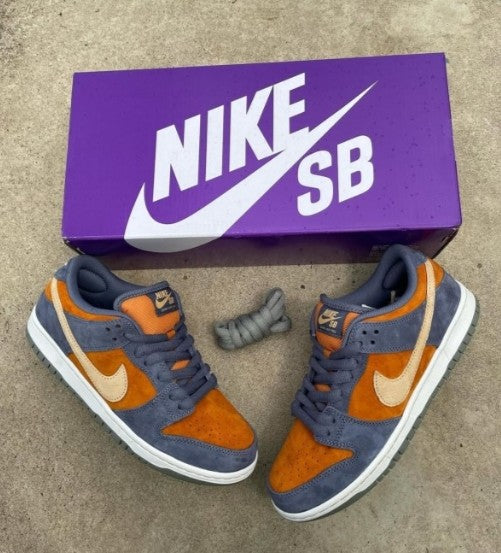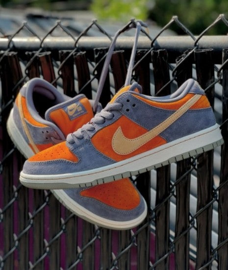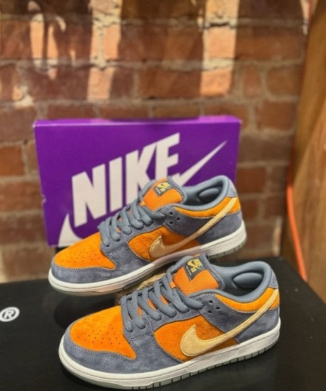 The Nike SB Dunk Low Pro "Light Carbon Monarch" features a premium suede upper with rich Light Carbon grey overlays and a bold Monarch orange base. Accented with Sesame on the Swoosh and heel, it sits atop a clean Summit White midsole and Dark Stucco outsole. Designed for both skate performance and everyday style, it includes Zoom Air cushioning and comes with extra laces for versatility. A perfect blend of earthy tones and comfort.