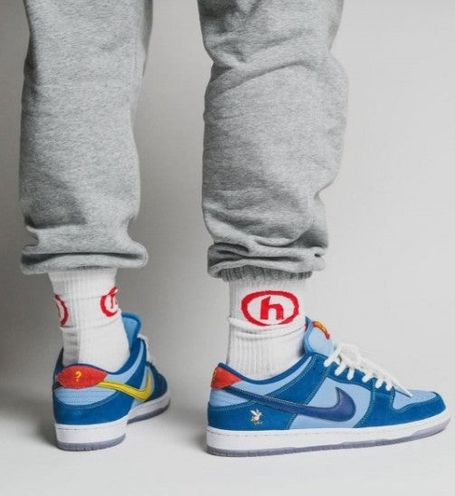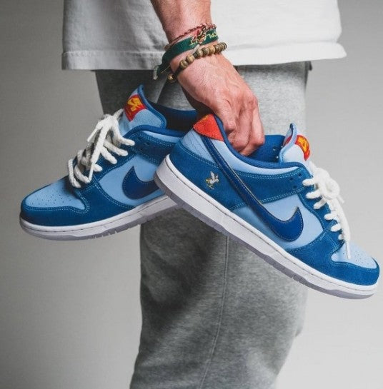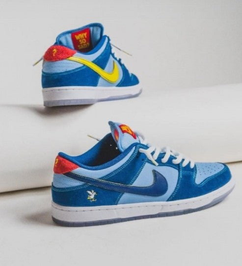The The Nike SB Dunk Low "Why So Sad?" is a special collaboration with Scottish skateboarder John Rattray to raise mental health awareness. It features a mix of light blue and navy suede with hidden details like a wear-away Swoosh that reveals yellow underneath, symbolizing hope. A custom sad-eyed bird logo on the heel and unique insoles complete the storytelling theme.