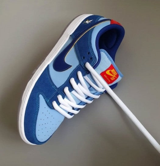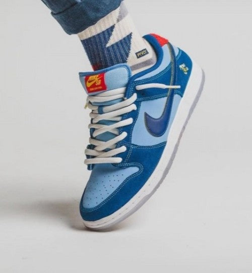 is a special collaboration with Scottish skateboarder John Rattray to raise mental health awareness. It features a mix of light blue and navy suede with hidden details like a wear-away Swoosh that reveals yellow underneath, symbolizing hope. A custom sad-eyed bird logo on the heel and unique insoles complete the storytelling theme.